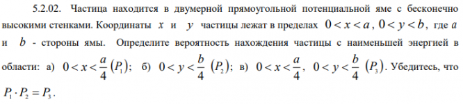 Частица находится в двумерной прямоугольной потенциальной яме с бесконечно высокими стенками. Координаты x и y частицы лежат в пределах.