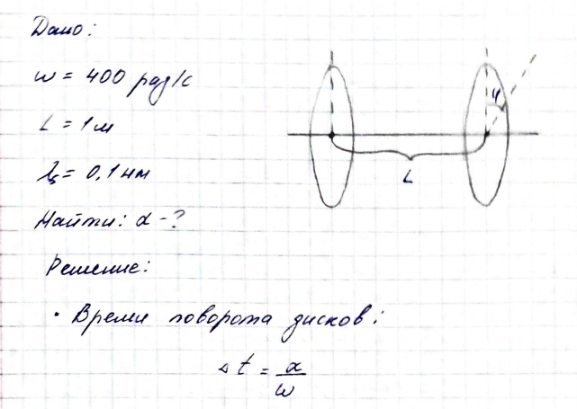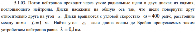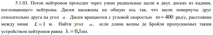 Поток нейтронов проходит через узкие радиальные щели в двух дисках из кадмия, поглощающего нейтроны. Диски насажены на общую ось так, что щели повернуты друг относительно друга на угол  ..