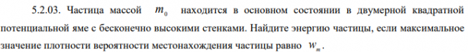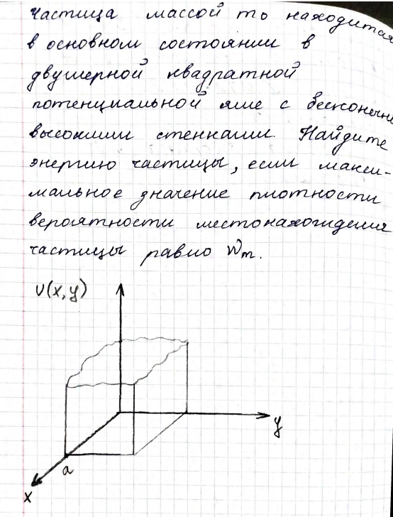 Частица массой m0 находится в основном состоянии в двумерной квадратной потенциальной яме с бесконечно высокими стенками. Найдите энергию частицы, если максимальное значение плотности вероятности местонахождения частицы равно.