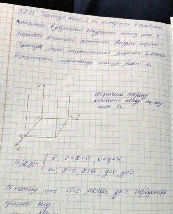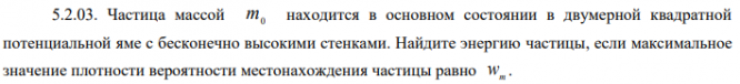 Частица массой m0 находится в основном состоянии в двумерной квадратной потенциальной яме с бесконечно высокими стенками. Найдите энергию частицы, если максимальное значение плотности вероятности местонахождения частицы равно.