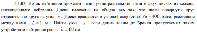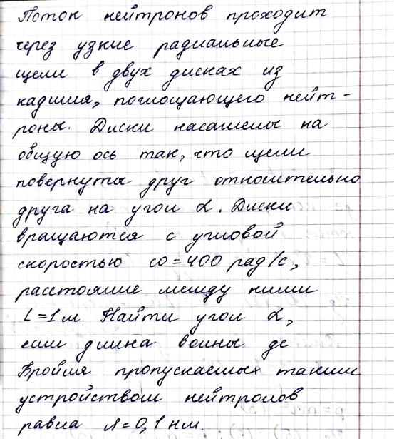 Поток нейтронов проходит через узкие радиальные щели в двух дисках из кадмия, поглощающего нейтроны. Диски насажены на общую ось так, что щели повернуты друг относительно друга на угол .
