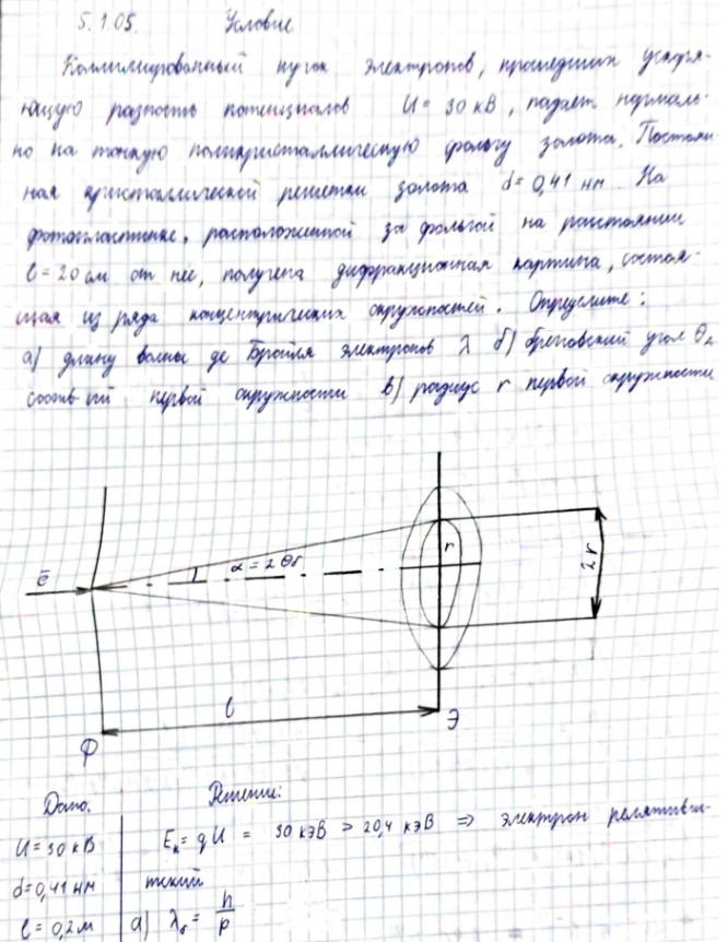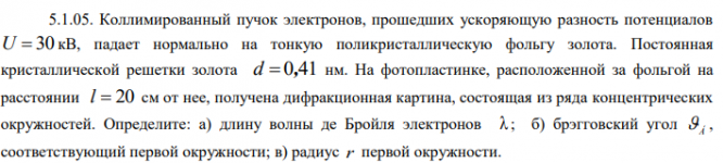Коллимированный пучок электронов, прошедших ускоряющую разность потенциалов U 30 кВ, падает нормально на тонкую поликристаллическую фольгу золота. Постоянная кристаллической решетки золота d 0,41 нм.