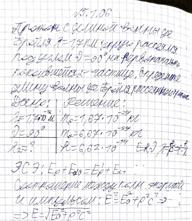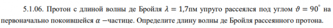 Протон с длиной волны де Бройля 𝜆 = 1,7пм упруго рассеялся под углом 𝜗 = 90° на первоначально покоившейся 𝛼 −частице. Определите длину волны де Бройля рассеянного протона..
