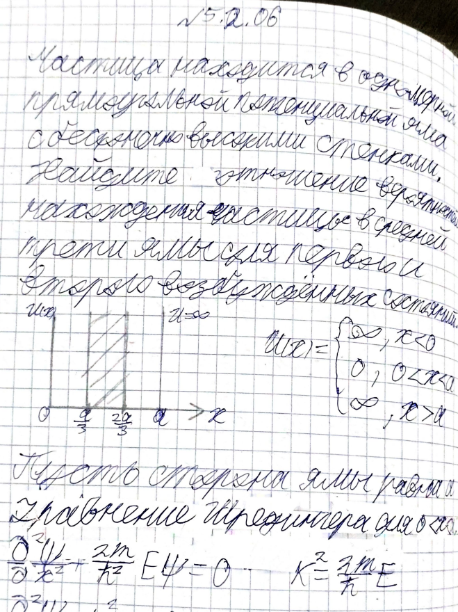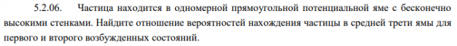 Частица находится в одномерной прямоугольной потенциальной яме с бесконечно высокими стенками. Найдите отношение вероятностей нахождения частицы в средней трети ямы для первого и второго возбужденных состояний..