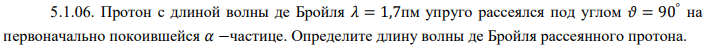 Протон с длиной волны де Бройля 𝜆 = 1,7пм упруго рассеялся под углом 𝜗 = 90° на первоначально покоившейся 𝛼 −частице. Определите длину волны де Бройля рассеянного протона.