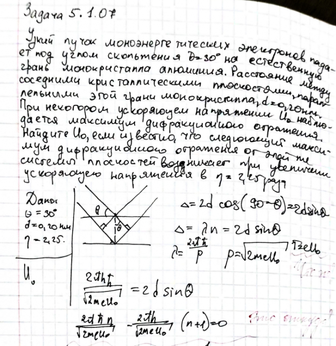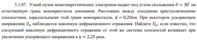 Узкий пучок моноэнергетических электронов падает под углом скольжения 𝜗 = 30° на естественную грань монокристалла алюминия. Расстояние между соседними кристаллическими плоскостями, параллельными этой грани монокристалла, 𝑑 = 0,20нм.