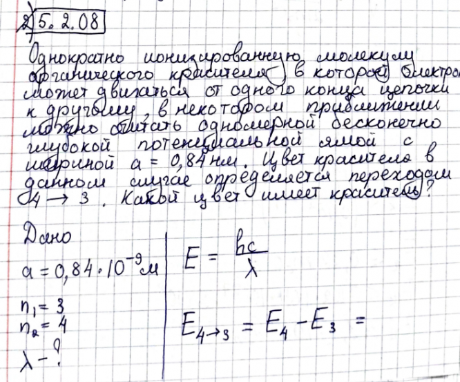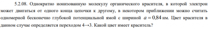 Однократно ионизованную молекулу органического красителя, в которой электрон может двигаться от одного конца цепочки к другому, в некотором приближении можно считать одномерной бесконечно глубокой потенциальной ямой с шириной.