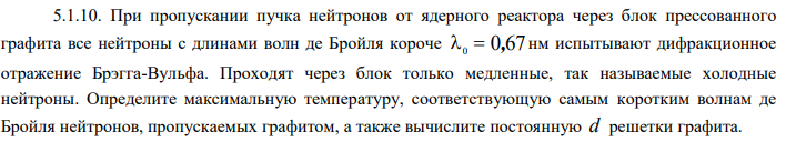 При пропускании пучка нейтронов от ядерного реактора через блок прессованного графита все нейтроны с длинами волн де Бройля короче 0 0,67 нм испытывают дифракционное отражение Брэгга-Вульфа..