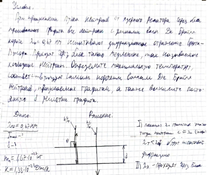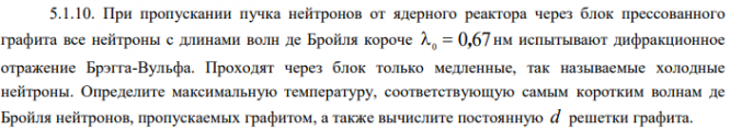 При пропускании пучка нейтронов от ядерного реактора через блок прессованного графита все нейтроны с длинами волн де Бройля короче 0 0,67 нм испытывают дифракционное отражение Брэгга-Вульфа..
