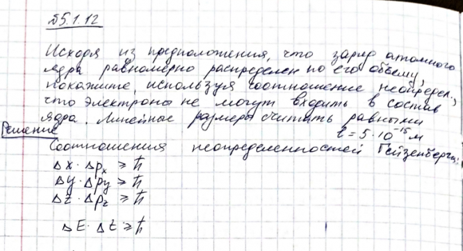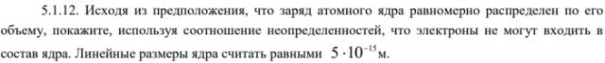 Исходя из предположения, что заряд атомного ядра равномерно распределен по его объему, покажите, используя соотношение неопределенностей, что электроны не могут входить в состав ядра. Линейные размеры ядра считать равными 5 15 10  м..