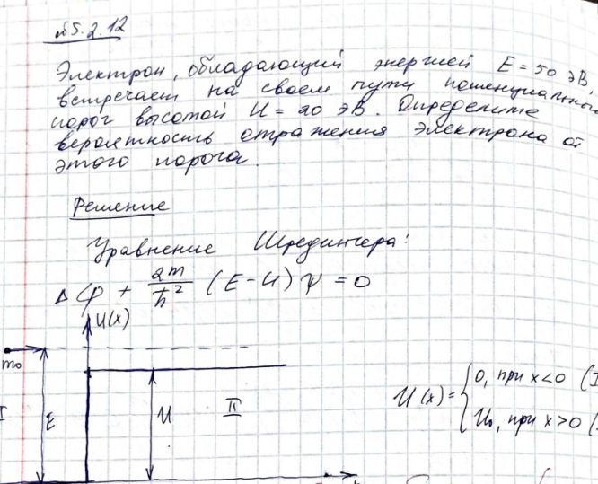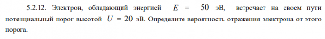 Электрон, обладающий энергией E = 50 эВ, встречает на своем пути потенциальный порог высотой U = 20 эВ. Определите вероятность отражения электрона от этого порога..