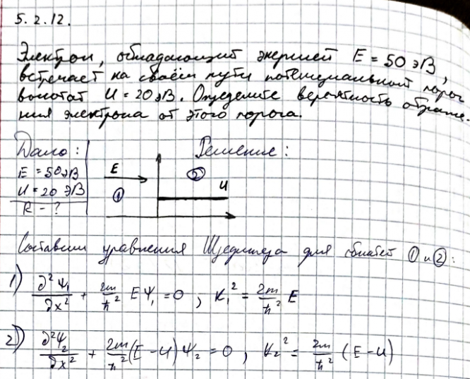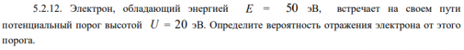 Электрон, обладающий энергией E = 50 эВ, встречает на своем пути потенциальный порог высотой U = 20 эВ. Определите вероятность отражения электрона от этого порога..