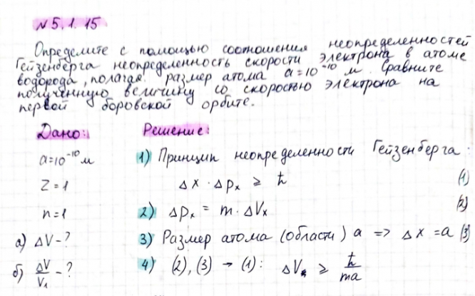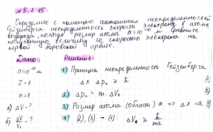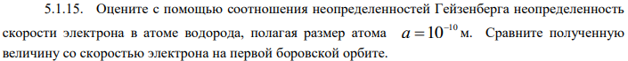 Оцените с помощью соотношения неопределенностей Гейзенберга неопределенность скорости электрона в атоме водорода, полагая размер атома 10 10 a м. Сравните полученную величину со скоростью электрона на первой боровской орбите..