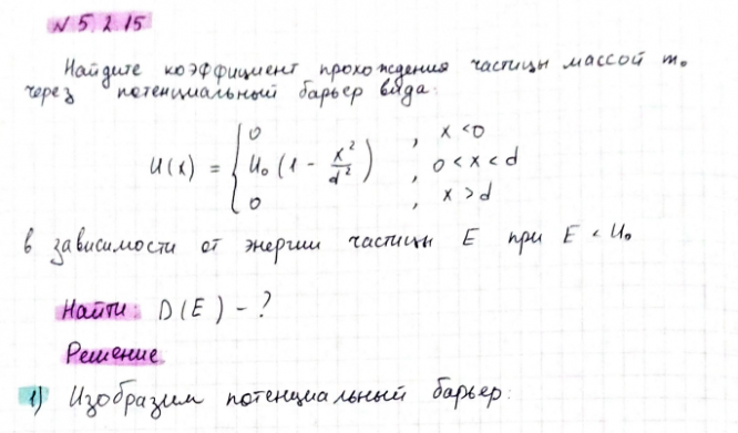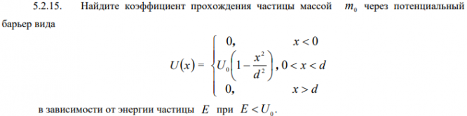 Найдите коэффициент прохождения частицы массой m0 через потенциальный барьер вида.