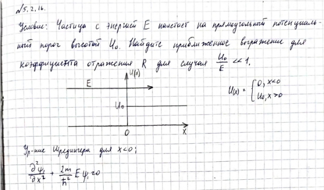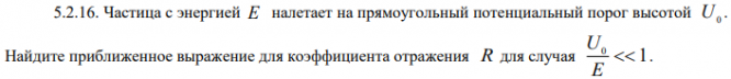 Частица с энергией E налетает на прямоугольный потенциальный порог высотой U0 . Найдите приближенное выражение для коэффициента отражения R для случа.
