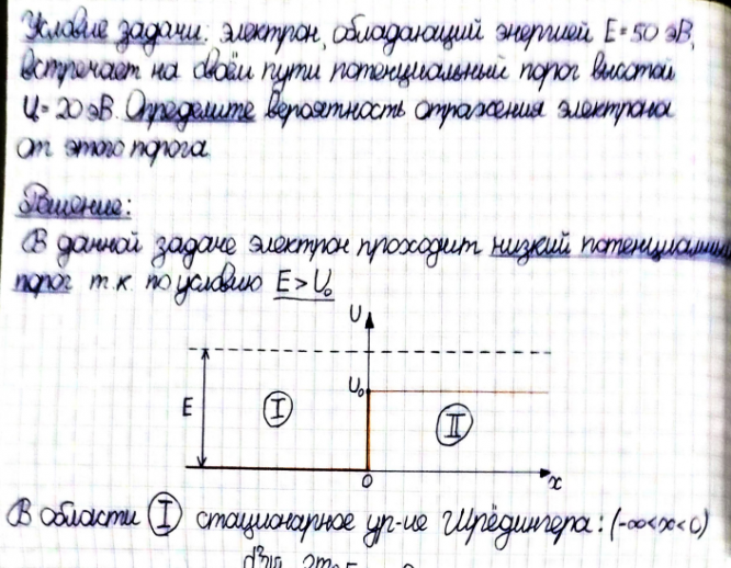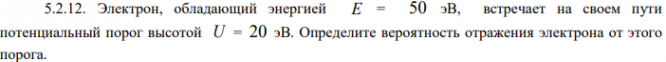 Электрон, обладающий энергией E = 50 эВ, встречает на своем пути потенциальный порог высотой U = 20 эВ. Определите вероятность отражения электрона от этого порога.