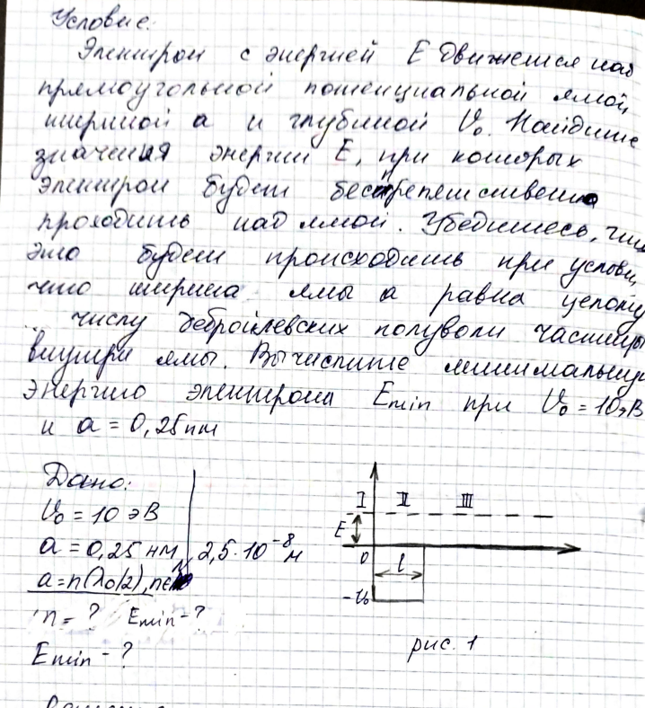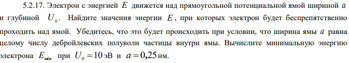 Электрон с энергией E движется над прямоугольной потенциальной ямой шириной a и глубиной U0 . Найдите значения энергии E , при которых электрон.