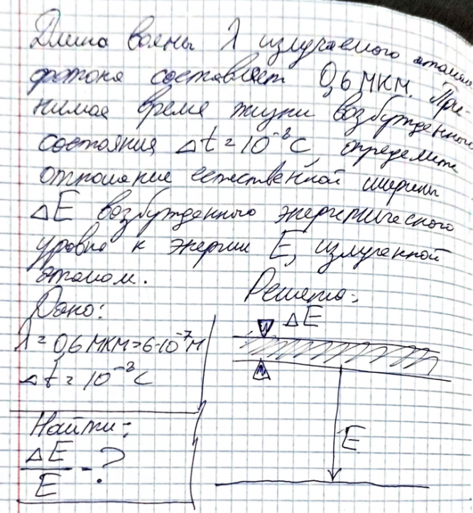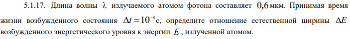 Длина волны излучаемого атомом фотона составляет 0,6 мкм. Принимая время жизни возбужденного состояния 8 10 t с, определите отношение естественной ширины E возбужденного энергетического уровня к энергии E , излученной атомом..
