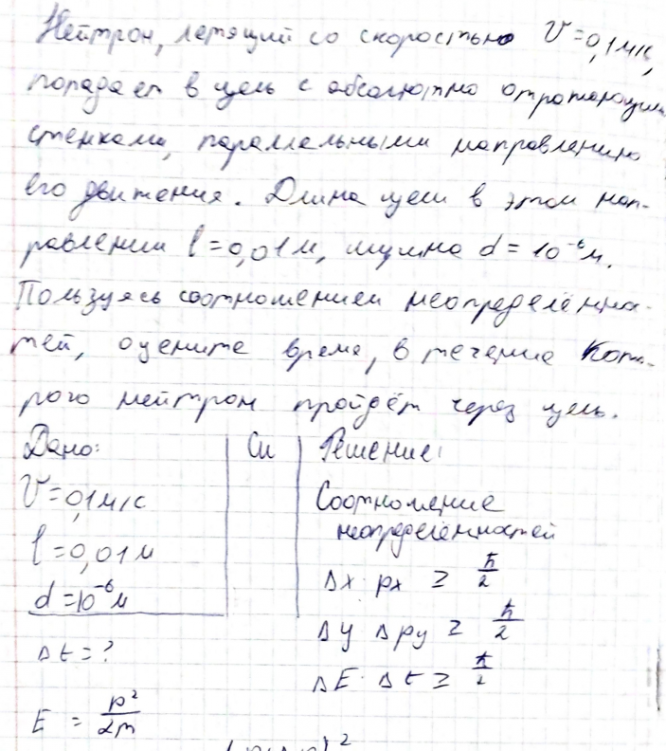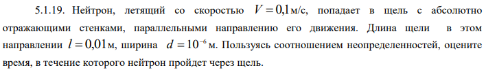 Нейтрон, летящий со скоростью V 0,1 м/с, попадает в щель с абсолютно отражающими стенками, параллельными направлению его движения. Длина щели в этом направлении l 0,01 м, ширина 6 10 d м. Пользуясь соотношением неопределенностей, оцените время, в течение которого нейтрон пройдет через щель. .