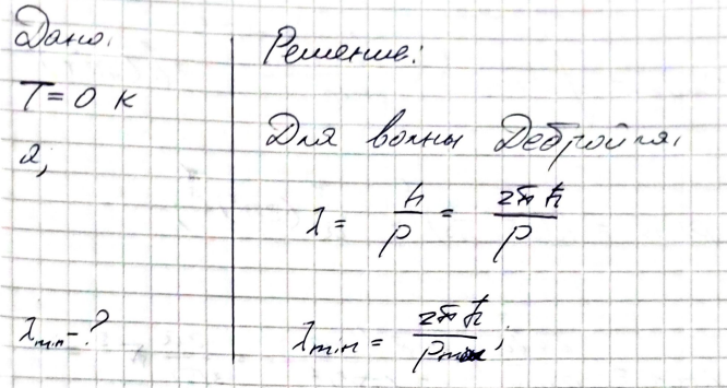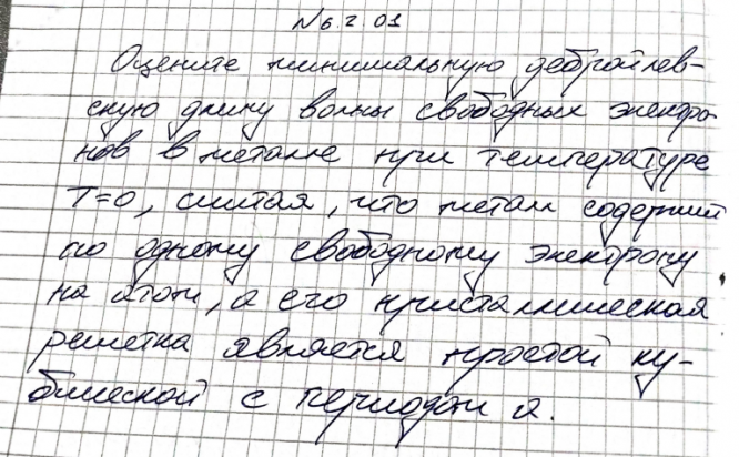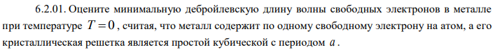 Оцените минимальную дебройлевскую длину волны свободных электронов в металле при температуре T 0 , считая, что металл содержит по одному свободному электрону на атом, а его кристаллическая решетка является простой кубической с периодом a .