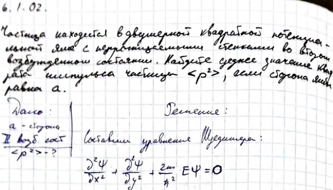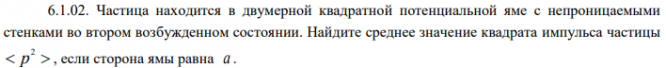 Частица находится в двумерной квадратной потенциальной яме с непроницаемыми стенками во втором возбужденном состоянии. Найдите среднее значение квадрата импульса частицы 2 p , если сторона ямы равна a.