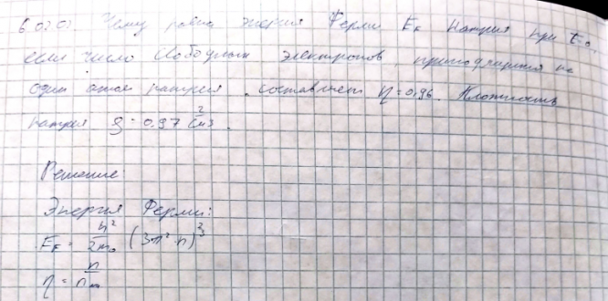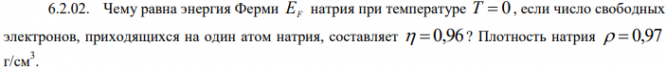 Чему равна энергия Ферми EF натрия при температуре T 0 , если число свободных электронов, приходящихся на один атом натрия, составляет 0,96 ? Плотность натрия 0,97 г/см 3 ..