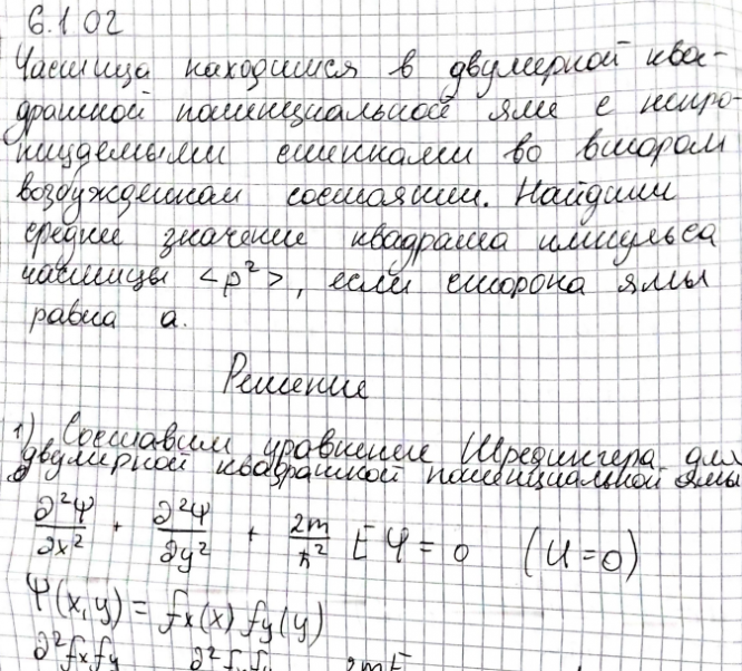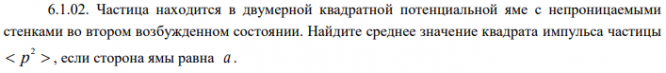 Частица находится в двумерной квадратной потенциальной яме с непроницаемыми стенками во втором возбужденном состоянии. Найдите среднее значение квадрата импульса частицы 2 p , если сторона ямы равна a ..