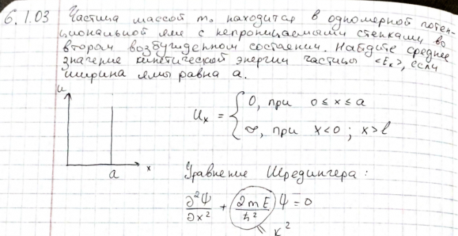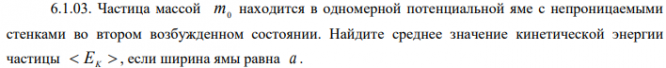 Частица массой m0 находится в одномерной потенциальной яме с непроницаемыми стенками во втором возбужденном состоянии. Найдите среднее значение кинетической энергии частицы EK , если ширина ямы равна a ..