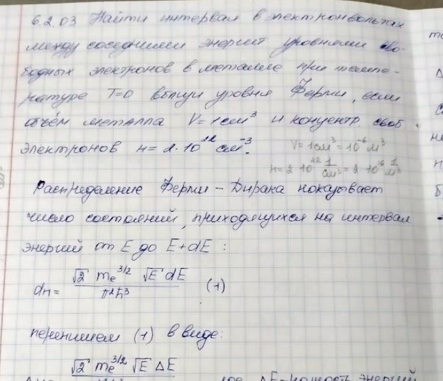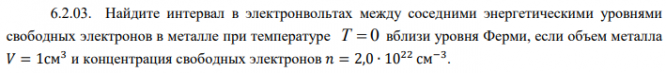 Найдите интервал в электронвольтах между соседними энергетическими уровнями свободных электронов в металле при температуре T 0 вблизи уровня Ферми, если объем металла 𝑉 = 1см3 и концентрация свободных электронов 𝑛 = 2,0 ∙ 1022 см−3 . .