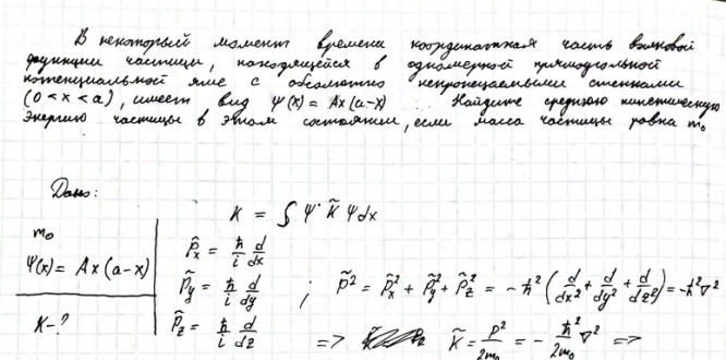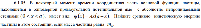В некоторый момент времени координатная часть волновой функции частицы, находящейся в одномерной прямоугольной потенциальной яме с абсолютно непроницаемыми стенками ( 0 x a ), имеет вид. Найдите среднюю кинетическую энергию частицы в этом состоянии, если масса частицы равна m.