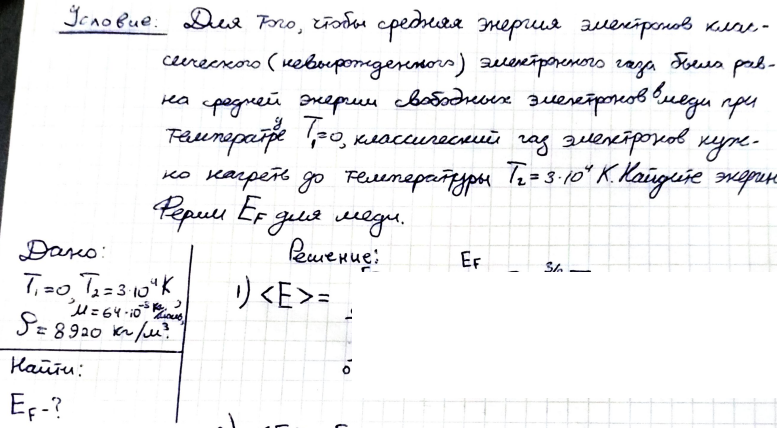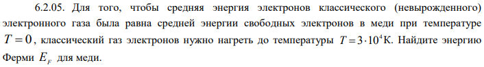 Для того, чтобы средняя энергия электронов классического (невырожденного) электронного газа была равна средней энергии свободных электронов в меди при температуре T 0 , классический газ электронов нужно нагреть до температуры 4 T 310 К. Найдите энергию Ферми EF для меди.