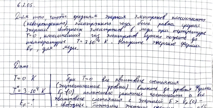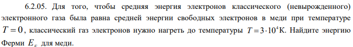 Для того, чтобы средняя энергия электронов классического (невырожденного) электронного газа была равна средней энергии свободных электронов в меди при температуре T 0 , классический газ электронов нужно нагреть до температуры 4 T 310 К. Найдите энергию Ферми EF для меди. .