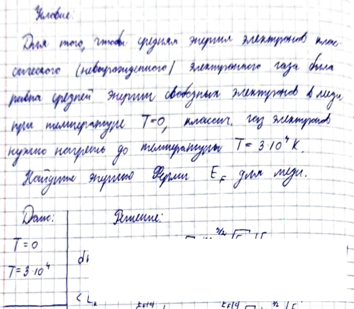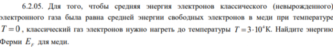 Для того, чтобы средняя энергия электронов классического (невырожденного) электронного газа была равна средней энергии свободных электронов в меди при температуре T 0 , классический газ электронов нужно нагреть до температуры 4 T 310 К. Найдите энергию Ферми EF для меди. .