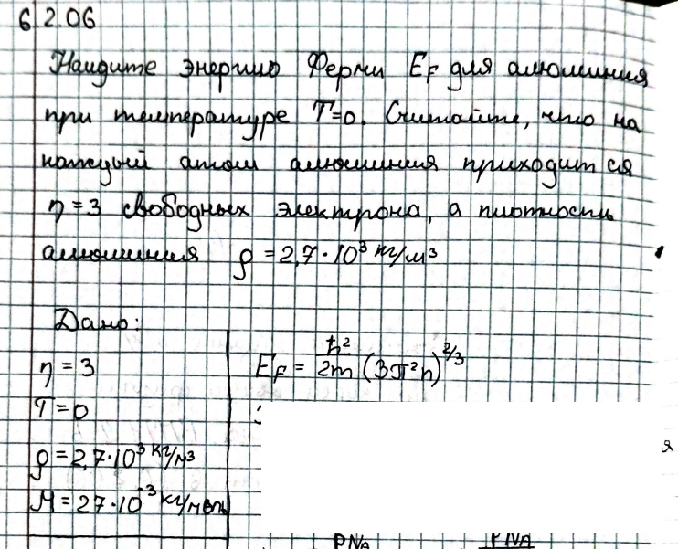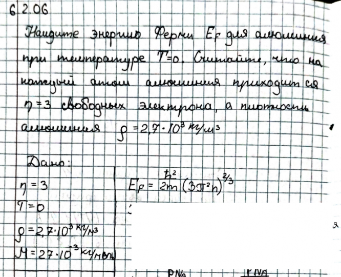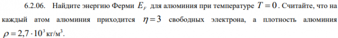 Найдите энергию Ферми EF для алюминия при температуре T 0 . Считайте, что на каждый атом алюминия приходится 3 свободных электрона, а плотность алюминия 3 2,7 10 кг/м 3 . .