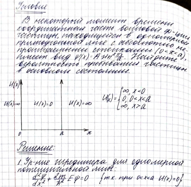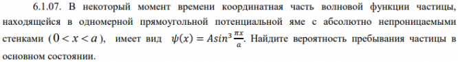В некоторый момент времени координатная часть волновой функции частицы, находящейся в одномерной прямоугольной потенциальной яме с абсолютно непроницаемыми стенками ( 0  x  a ), имеет вид 𝜓(𝑥) = 𝐴𝑠𝑖𝑛3 𝜋𝑥 𝑎 . Найдите вероятность пребывания частицы в основном состоянии. .
