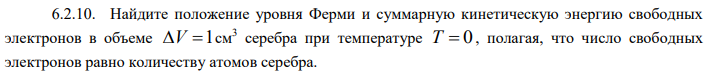 Найдите положение уровня Ферми и суммарную кинетическую энергию свободных электронов в объеме V 1 см3 серебра при температуре T 0 , полагая, что число свободных электронов равно количеству атомов серебра.