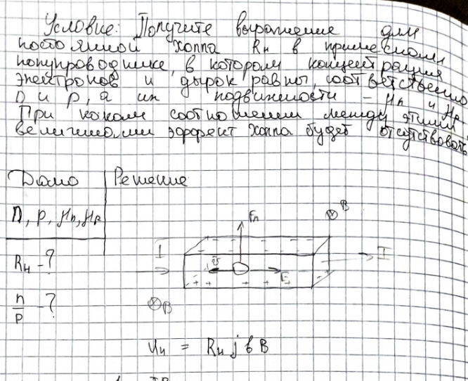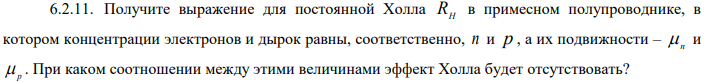 Получите выражение для постоянной Холла RH в примесном полупроводнике, в котором концентрации электронов и дырок равны, соответственно, n и p , а их подвижности – n и p . При каком соотношении между этими величинами эффект Холла будет отсутствовать? .