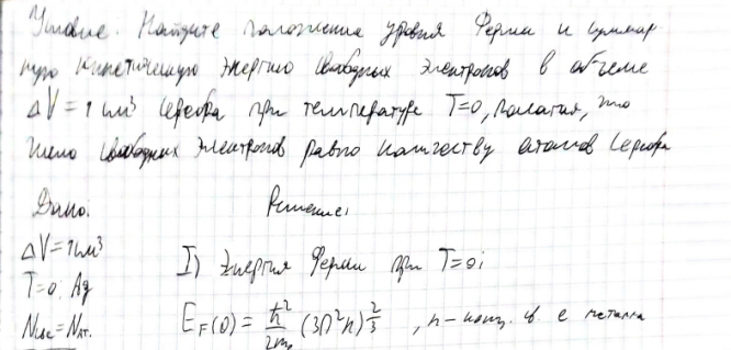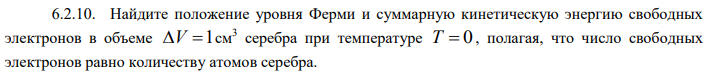 Найдите положение уровня Ферми и суммарную кинетическую энергию свободных электронов в объеме V 1 см3 серебра при температуре T 0 , полагая, что число свободных электронов равно количеству атомов серебра. .