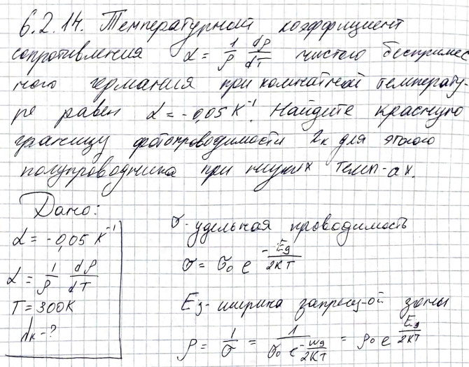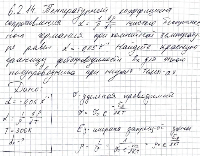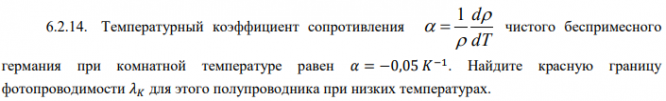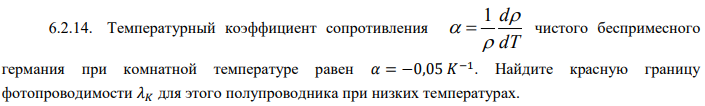 Температурный коэффициент сопротивления чистого беспримесного германия при комнатной температуре равен 𝛼 = −0,05 𝐾 −1 . Найдите красную границу фотопроводимости 𝜆𝐾 для этого полупроводника при низких температурах..
