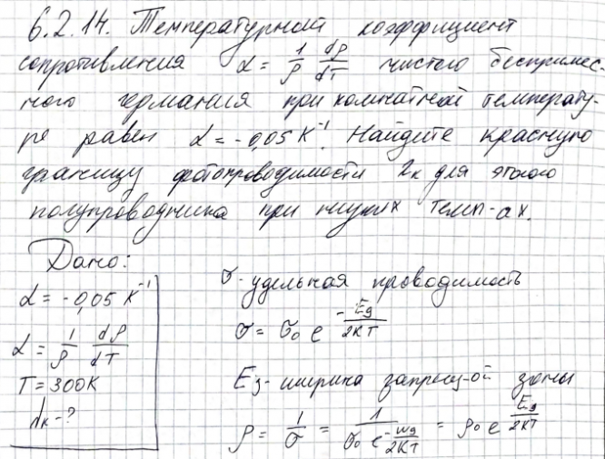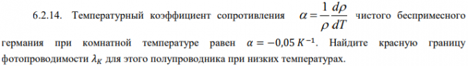 Температурный коэффициент сопротивления чистого беспримесного германия при комнатной температуре равен 𝛼 = −0,05 𝐾 −1 . Найдите красную границу фотопроводимости 𝜆𝐾 для этого полупроводника при низких температурах..