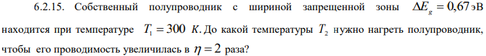 Собственный полупроводник с шириной запрещенной зоны E g 0,67 эВ находится при температуре T1 300 𝐾. До какой температуры T2 нужно нагреть полупроводник, чтобы его проводимость увеличилась в 2 раза? .