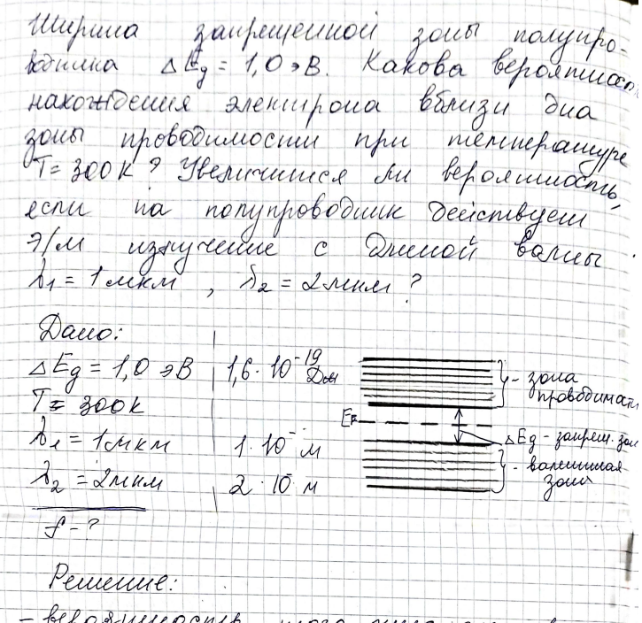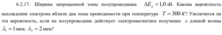 Ширина запрещенной зоны полупроводника E g 1,0 эВ. Какова вероятность нахождения электрона вблизи дна зоны проводимости при температуре T 300 𝐾? Увеличится ли эта вероятность, если на полупроводник действует электромагнитное излучение с длиной волны 1 1 мкм; 2 2 мкм?.