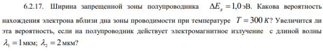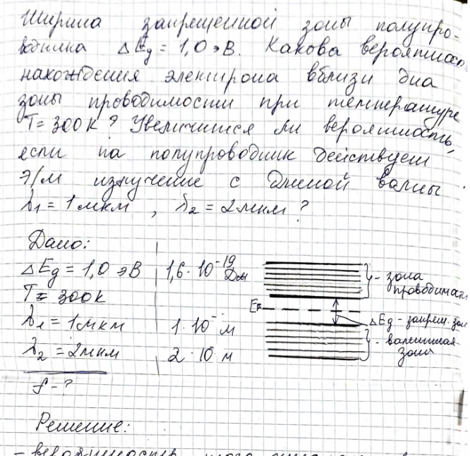 Ширина запрещенной зоны полупроводника E g 1,0 эВ. Какова вероятность нахождения электрона вблизи дна зоны проводимости при температуре T  300 𝐾? Увеличится ли эта вероятность, если на полупроводник действует электромагнитное излучение с длиной волны 1 1 мкм; 2  2 мкм?.