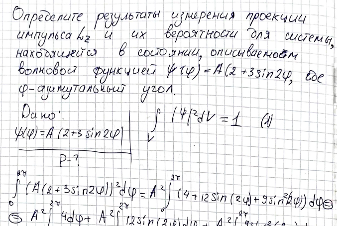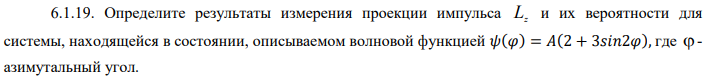 Определите результаты измерения проекции импульса L z и их вероятности для системы, находящейся в состоянии, описываемом волновой функцией 𝜓(𝜑) = 𝐴(2 + 3𝑠𝑖𝑛2𝜑), где - азимутальный угол..