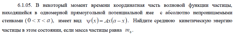 6.1.05. В некоторый момент времени координатная часть волновой функции частицы, находящейся в одномерной прямоугольной потенциальной яме с абсолютно непроницаемыми стенками (0 x a ), имеет вид x Axa x. Найдите среднюю кинетическую энергию частицы в этом состоянии, если масса частицы равна 0 m ..