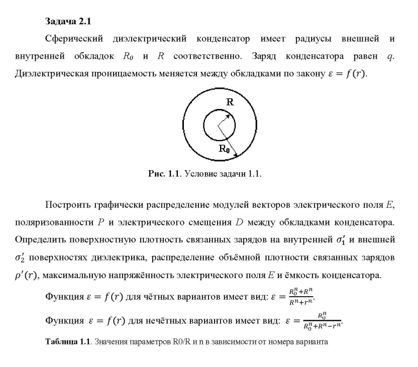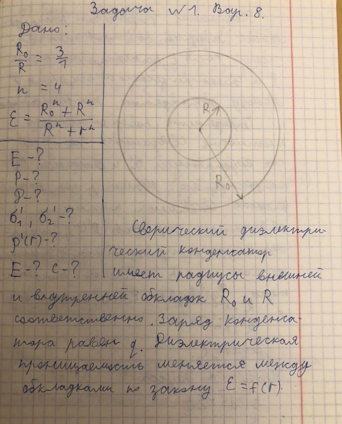 Сферический диэлектрический конденсатор имеет радиусы внешней и внутренней обкладок R0 и R соответственно. Заряд конденсатора равен q. Диэлектрическая проницаемость меняется между обкладками по закону ԑ=f(r). Построить графически распределение модулей векторов электрического поля Е, поляризованности Р и электрического смещения D между обкладками конденсатора. Определить поверхностную плотность связанных зарядов на внутренней σ1и внешней σ2поверхностях диэлектрика, распределение объёмной плотности связанных зарядов ρ(r), максимальную напряженность электрического поля Е и ёмкость конденсатора.