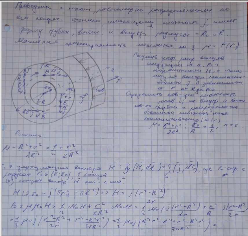 Проводник с током, равномерно распределённым по его поперечному сечению с плотность j, имеет форму трубки круглого поперечного сечения, внешний и внутренний радиусы которого равны R0 и R соответственно. Магнитная проницаемость магнетика задана зависимостью µ=f(r), где r – расстояние от оси трубки.