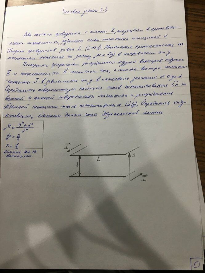 Построить графически распределения модулей векторов индукции B и напряжённости H магнитного поля, а также вектора намагниченности J в зависимости от у в интервале значений от 0 до d. Определить поверхностную плотность токов намагничивания на верхней и нижней поверхностях магнетика и распределение объёмной плотности токов намагничивания .Определить индуктивность единицы длины этой двухполосной линии.