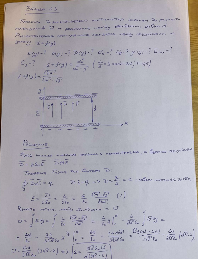 Построить графически распределение модулей векторов электрического поля Е, поляризованности Р и электрического смещения D между обкладками конденсатора. Определить поверхностную плотность связанных зарядов на нижней и верхней поверхностях диэлектрика, распределение объёмной плотности связанных зарядов , максимальную напряжённость электрического поля Е и ёмкость конденсатора на единицу площади.