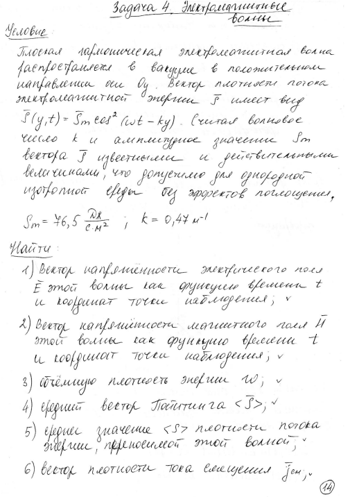 Плоская гармоническая электромагнитная волна распространяется в вакууме в положительном направлении оси Oy. Вектор плотности потока электромагнитной энергии S имеет вид: . Считая волновое число k и амплитудное значение вектора известными действительными величинами, что допустимо для однородной изотропной среды без эффектов поглощения, найти: